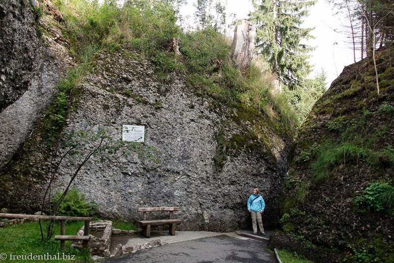 Immerhin aber dauert unser Aufenthalt im Berggasthaus lange genug, dass es draußen nur noch ein wenig tröpfelt, als wir wieder aufbrechen und hinunter zu unserem Wanderweg steigen. Wobei allerdings Vorsicht geboten ist. Denn die Stufen, die vom oberen Ortsteil hinab auf den Weg nach Urmiberg führen, sind aus Holz und damit bei Nässe extrem glitschig. Im Gegensatz zu unserer Wanderung zur Gletschermühle bei Todtmoos reißt es mir zwar nicht die Füße vom Boden. Dass ich nicht falle, habe ich (neben meiner Reaktion) aber vor allem Annette zu verdanken.
