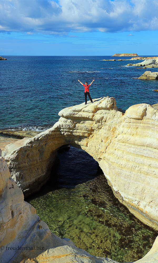 Wir laufen ein kurzes Stück über Bitumen, bevor wir in die Einfahrt zu einer Art Clubhotel einbiegen. Hier ermöglicht es ein Ausguck, auf den Strand von Kafizis blicken. Beim Hoteleingang beginnt eine schmale, mit Flusskiesel gepflasterte Promenade, die beschaulich an den Villengrundstücken vorbeiführt. Hier und da hat man schöne Aussichten über die weiße Felsküste. Nach knapp einem Kilometer endet die Promenade. Der Wanderweg verläuft nun als Pfad oberhalb der Kalkklippen. Bei den Sea Caves Villen bietet sich an, durch eine Art Flussbett bis zu den Klippen hinabzuklettern. Wir nutzen hingegen erst den schmalen Promenadenweg vor der zweiten Villensiedlung bis zu einem nahen Parkplatz. Vom Felsvorsprung südlich des Parkplatzes aus sind die Kantarkasti-Grotten am besten zu sehen. Als Aussichtspunkt auf die Meeresgrotten ist das Plateau unromantisch. Aber es erfüllt seinen Zweck. Durch ihre eher unnatürlich rechteckige Form scheinen die Wasserhöhlen wie von Menschenhand gemacht. Tatsächlich sind es natürlich erodierte Kalkhöhlen.